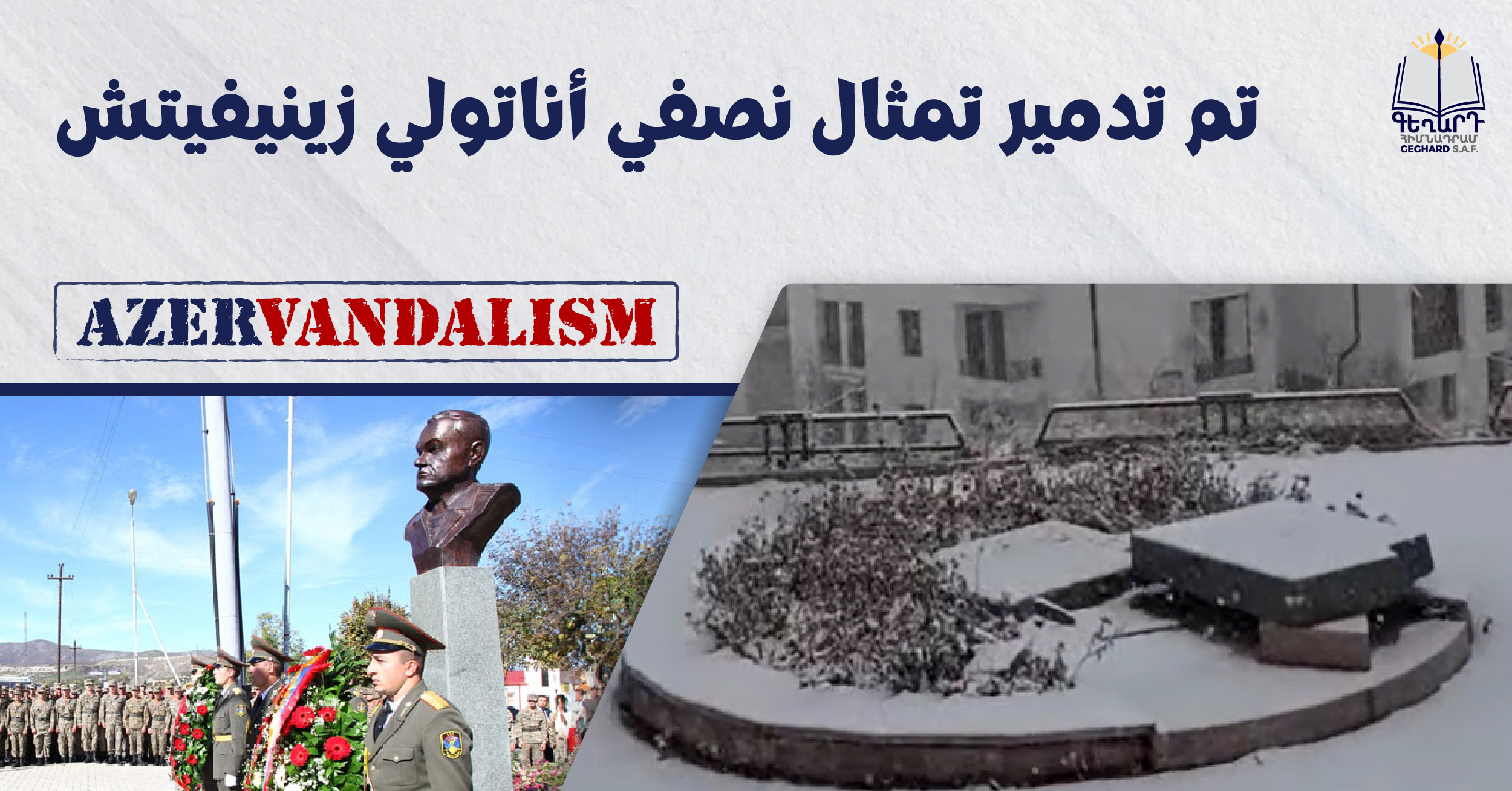 قام الأذربيجانيون بتدمير تمثال نصفي لفريق أناتولي زينيفيتش، الرئيس السابق لهيئة الأركان العامة لجيش الدفاع لجمهورية أرتساخ، والذي تم نصبه في عام ۲۰۱٤. وكان التمثال النصفي يقع في حي آرتساخ في ستيباناكيرت، على شارع أناتولي زينيفيتش، وكان يعتبر أحد معالم آرتساخ خلال فترة الاستقلال.