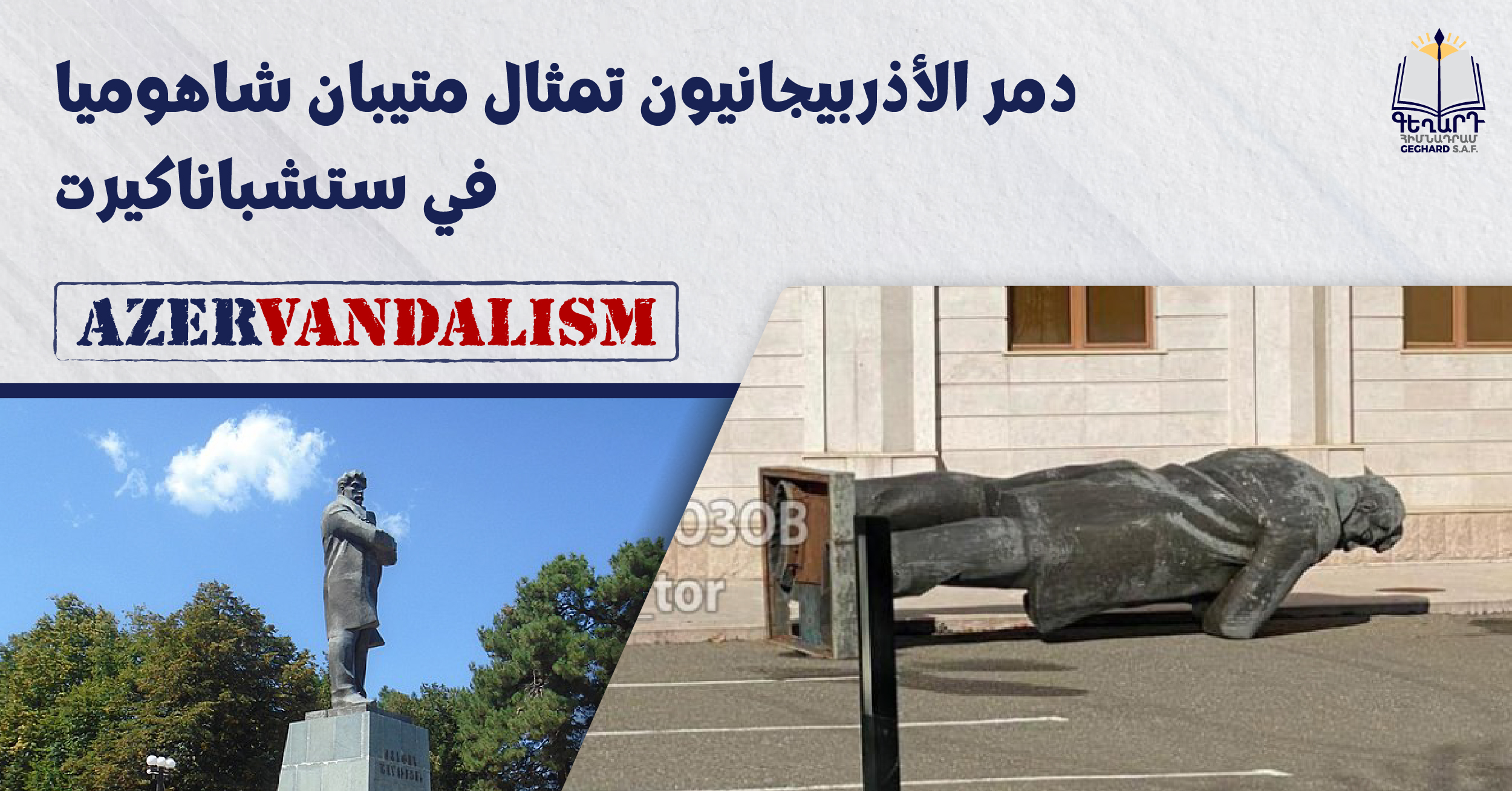 بعد تهجير الأرمن من آرتساخ، تواصل أذربيجان سياستها الحكومية المتمثلة في تدمير التراث الثقافي. يُظهر مقطع فيديو متداول على قنوات تيليغرام تمثالًا مُسقطًا للشخصية العامة والسياسية ستيبان شاهوميان في ساحة ستيباناكيرت، والذي استهدفته القوات المسلحة الأذربيجانية خلال حرب الـ٤٤ يومًا في عام ۲۰۲۰.