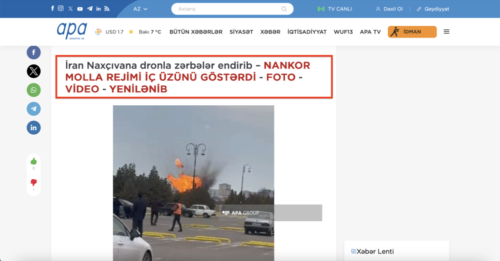 Subsequently, publications titled “Iran carried out attacks with four unmanned aerial vehicles – official,” “The Ministry of Defense released information about an attack by four UAVs,” and “Iran carried out attacks with four UAVs – Ministry of Defense” appeared in the Azerbaijani press, all citing the Azerbaijani Ministry of Defense.