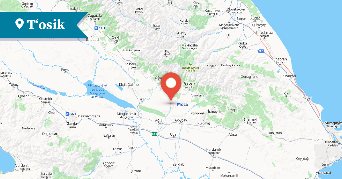Tʻosik was one of the Armenian villages of historical Caucasian Albania. It was located 22.7 km southwest of the present-day administrative centre of Gabala (Kutkashen).