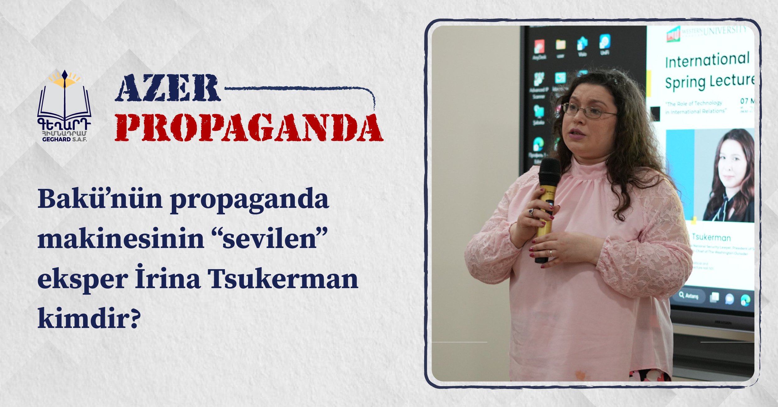 Amerikalı uzman İrina Tsukerman, yıllardır Azerbaycan'ın devlet propaganda aygıtının ve medyasının tercih ettiği uzmanlardan biri olup aktif biçimde Ermenistan karşıtı faaliyetler yürütmektedir. Tsukerman, uluslararası basında Bakü'nün propaganda tezleri ve anlatılarıyla bezeli makaleler yayımlayarak Ermenistan'ı ve onun politikalarını, ağırlıklı olarak Artsakh çatışması bağlamında, hedef almaktadır.